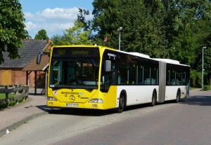 Am 30.09.2016 war 0625 der letzte Bus der Tages, der das Dorf erreicht. 0625 ist übrigens ein ehemaliger Vorführwagen, der mal für eine Messe vorgesehen war. Er war daher lange silber lackiert, auch auf dem Foto ist er es unter der Werbung noch. Der Bus ist übrigens baugleich mit dem Citaro, der 2008 mal in New York getestet wurde.